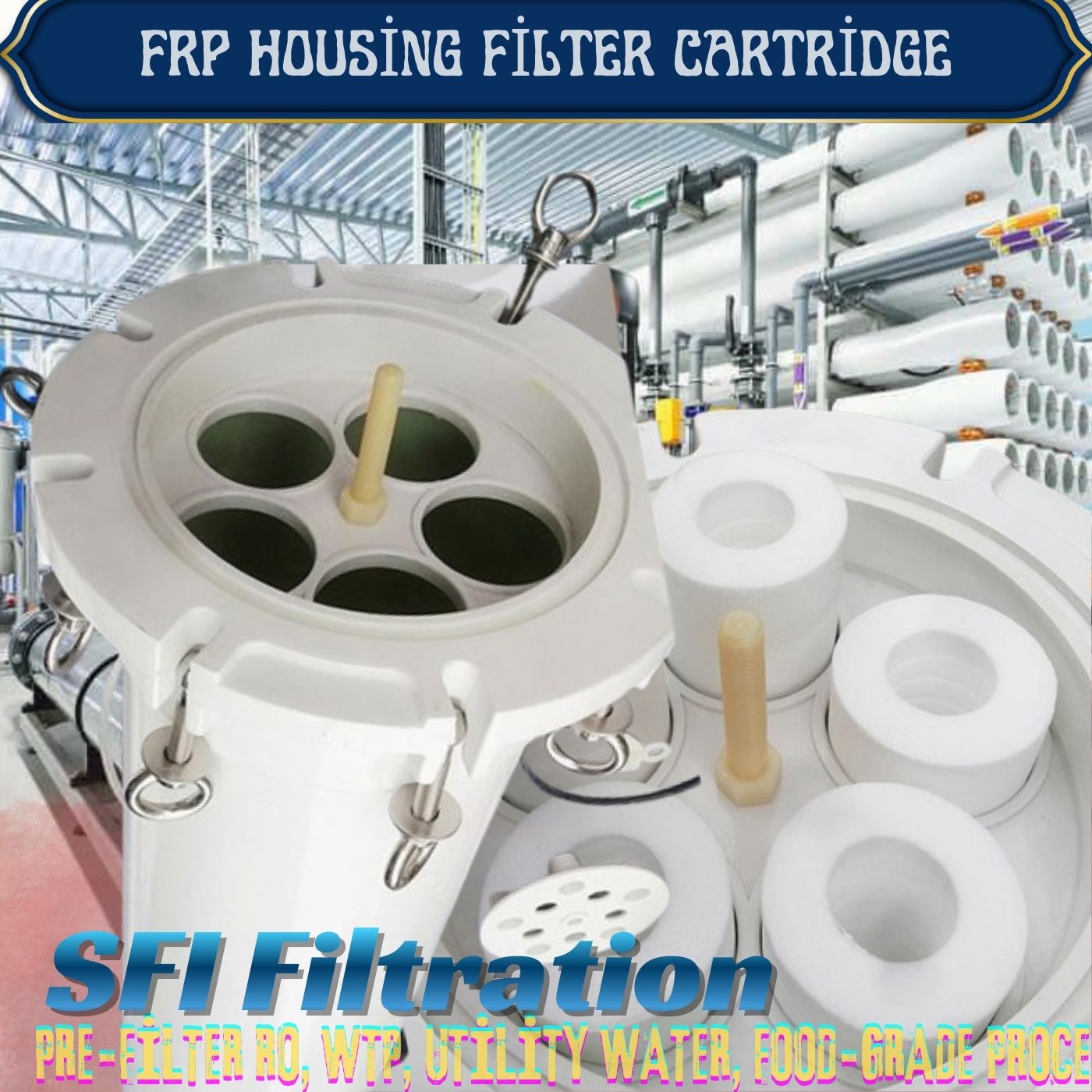 FRP Housing Multi Cartridge Filter SFI Filtration adalah pressure vessel filtrasi cairan berkapasitas besar berbahan Fiberglass Reinforced Plastic (FRP) yang dirancang untuk flow tinggi, lingkungan korosif, dan instalasi outdoor.